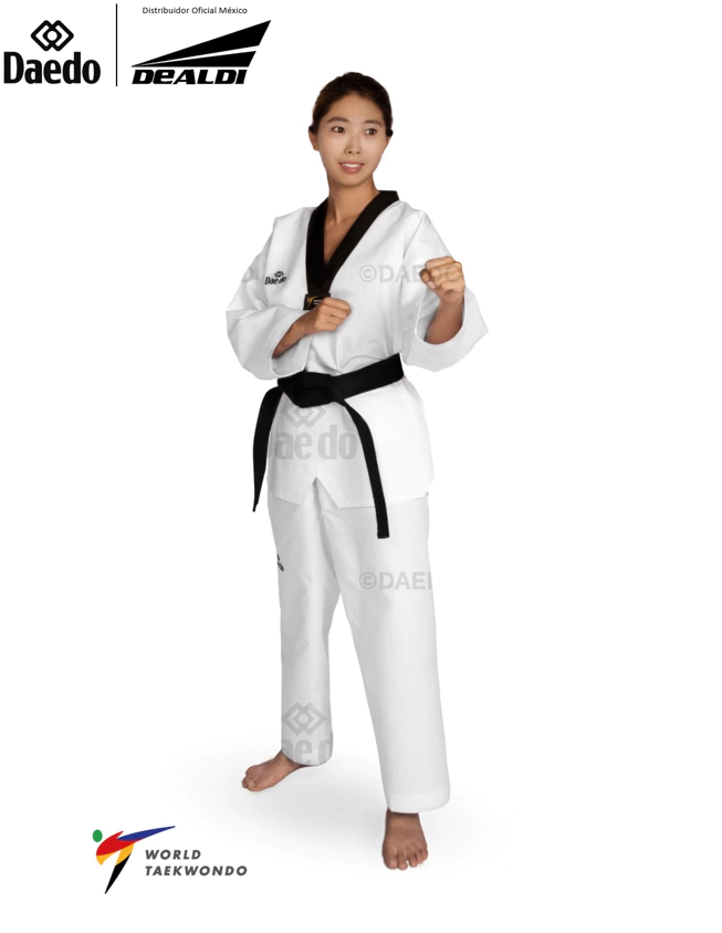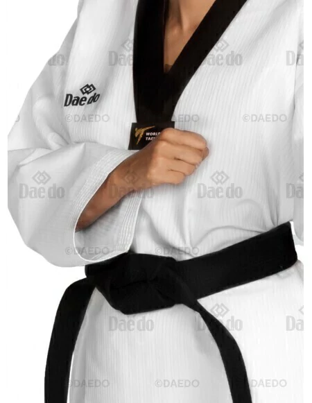 Tenemos a su disposición un dobok con cuello negro aprobado por la WT. Está fabricado por Poliéster 80%, Algodón 20%
